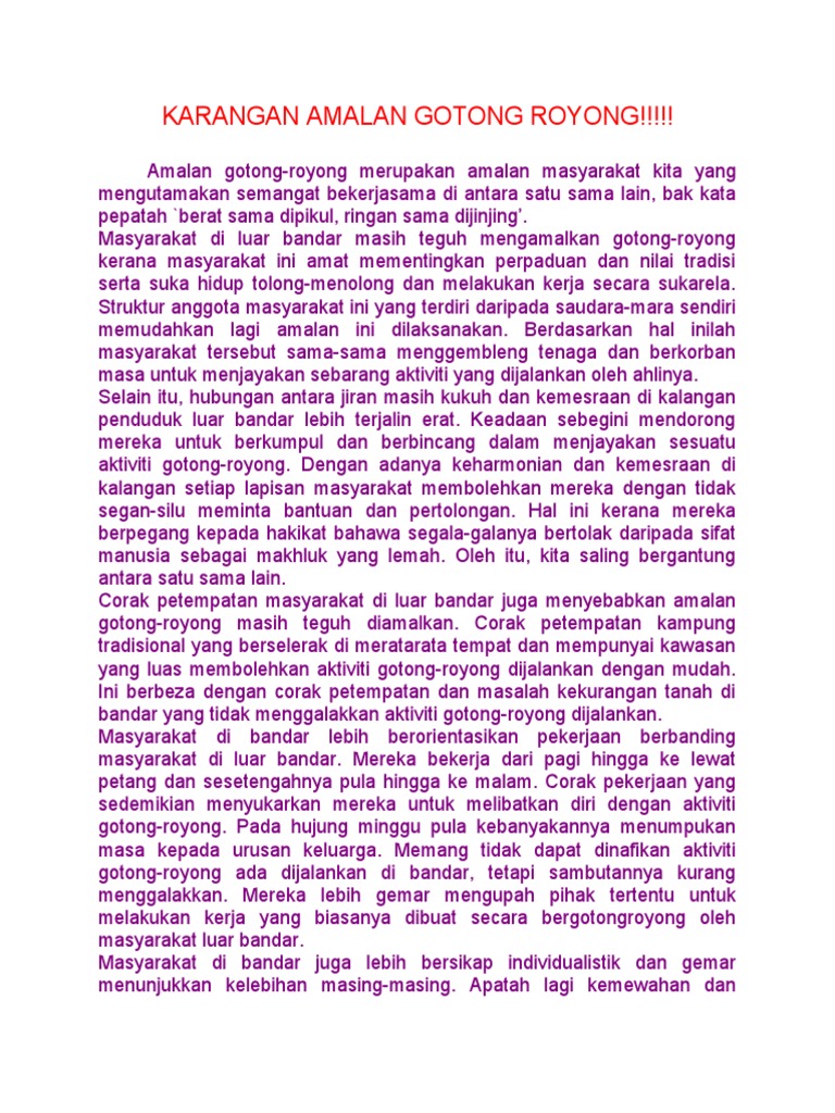 Ketika ada satu anggota masyarakat yang sedang kesulitan, maka anggota masyarakat lainnya akan sigap untuk melakukan pertolongan. Pasalnya sejak 31 des 2019 hgu tidak. Pada entri kali ini, kami ingin berkongsi tips berguna, contoh karangan syarahan dan format. Budaya gotong royong ini sesungguhnya bukan hal baru dalam peradaban manusia. Academia.edu is a platform for academics to share research papers.