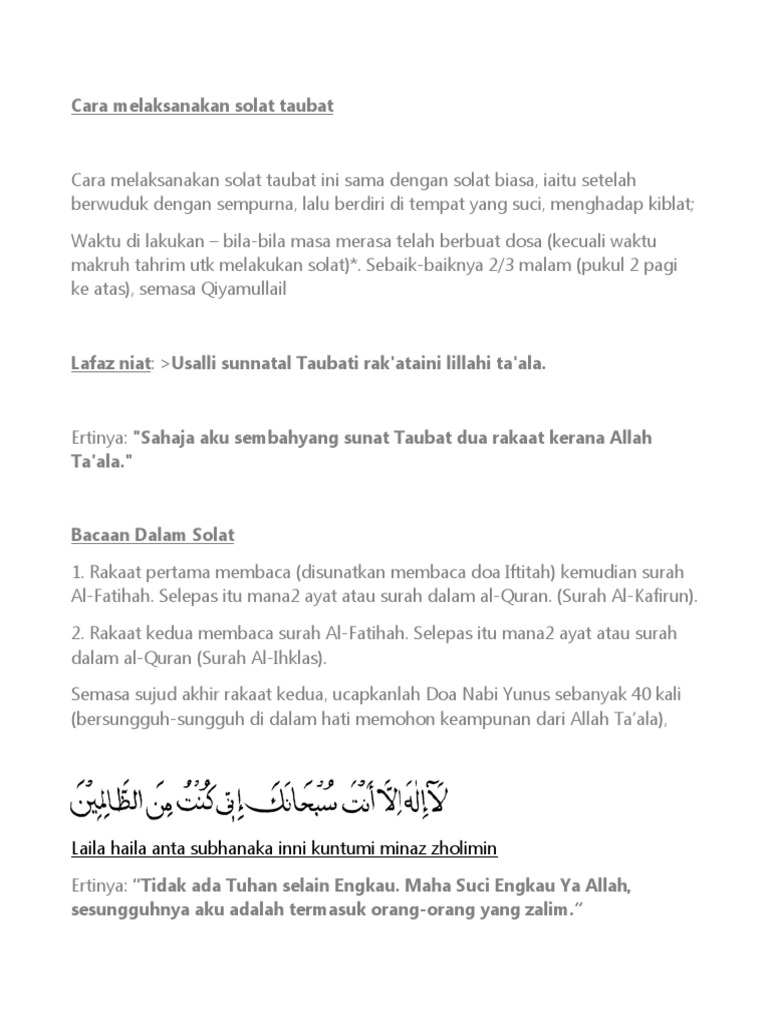 Cara Melaksanakan Solat Taubat Docx Document from demo.vdocuments.mx Ada yang membaca doa ini sebanyak 40 kali usai salat subuh tanpa putus. Doa nabi yunus merupakan doa yang kerap dibaca oleh para ulama. Ada yang membaca doa ini sebanyak 40 kali usai salat subuh tanpa putus. Membaca doa ini juga tak terbatas pada permintaan ketika ada hajat tertentu. Sesungguhnya sesiapa yang berbuat demikian akan diperkenankan doa dan. Jika pun tidak, anda pasti pernah merasakan dalam kondisi yang demikian. Doa nabi yunus merupakan doa yang kerap dibaca oleh para ulama. Doa nabi yunus untuk hajat mendesak, amalkan saat kondisi sulit!