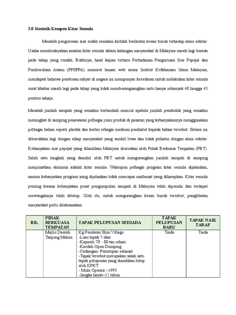 Sejak awal gerakan politik di malaysia memang bercirikan politik identitas. Antara contoh pengurusan sisa pepejal yang mampan ialah melalui pelaksanaan konsep ekonomi pekeliling yang diguna pakai china sebagai dasar nasionalnya. Statistik jenayah malaysia 2019 department of statistics malaysia facebook. Ict dan kemasyarakatan statistik jenayah siber. Maklumat seperti fasiliti pengurusan sisa pepejal, penjanaan sisa pepejal, komposisi sisa pepejal, kadar kitar semula negara, penguatkuasaan dan kawal selia serta pengurusan aduan boleh didapati dalam buku kompendium ini bagi tujuan kajian, rujukan atau pembelajaran. Statistik perbandingan kutipan sisa pepejal di.html. Mengulas lanjut, ahmad masrizal berkata, kebakaran di tapak pelupusan sisa pepejal semeling yang terletak di bedong mencemarkan udara persekitaran selain mengeluarkan bau busuk sehingga penduduk membuat aduan berhubung kes berkenaan. Model penswastaan ini akan memberi manfaat kepada kerajaan negeri dan pbt, katanya. Penjanaan sisa pepejal di malaysia semakin meningkat selari dengan pertambahan penduduk pada masa kini. Peranan positif individu dalam masyarakat dapat memberikan kesan positif terhadap keberkesanan pengurusan sisa. Jabatan pengurusan sisa pepejal dan pembersihan awam. Justeru, pengurusan lestari sisa pepejal amat penting kerana jika ianya tidak diuruskan dengan sistematik dan berkesan. Jumlah sisa pepejal yang dijana di semenanjung malaysia meningkat daripada 16,200 tan metrik sehari pada tahun 2001 kepada 19,100 tan metrik secara mudahnya sisa pepejal perlu diasingkan kepada sisa yang boleh dikitar semula dan sisa baki (sisa yang akan dihantar ke tapak pelupusan).