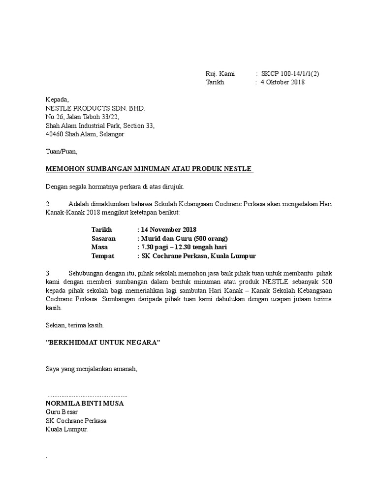 Contoh surat mohon tajaan via www.scribd.com. Savesave contoh surat memohon tajaan nestle for later. Related image with contoh surat mohon sumbangan syarikat. Begitu juga di hari sukan selalunya pihak sekolah akan memohon tajaan dari syarikat minuman seperti nestle milo 100 plus dan sebagainya. Surat rasmi mohon cuti kerja.